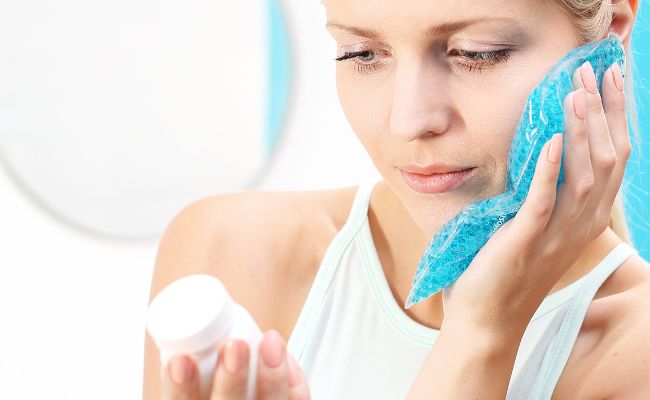 Přiložte na tvář v místě bolesti sáček s ledem zabalený v látce na 10–15 minut. Studený obklad pomůže splasknout otok od zubu a znecitliví bolestivou oblast.