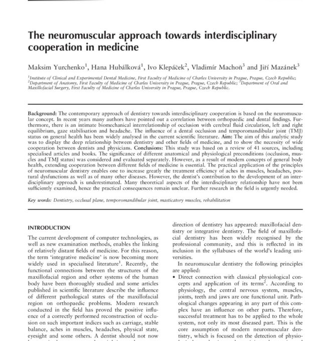 Die gegenwärtige Entwicklung der Computertechnologie und die Integration neuer Untersuchungsmethoden in die Praxis bietet eine Vielzahl von Möglichkeiten zur gegenseitigen Vernetzung scheinbar unabhängiger Bereiche der Medizin. Aus diesem Grund findet sich in der Literatur häufig der Begriff „integrative Medizin“. In den letzten Jahren wurde dem Einfluss des morphologischen und funktionellen Status der orofazialen Region auf andere Körpersysteme und die allgemeine Gesundheit viel Aufmerksamkeit geschenkt. International Dental Journal 2014 Feb; 64(1): 12-9