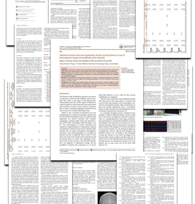 Heutzutage wird häufig auf den Zusammenhang zwischen Kaumuskelpathologie und Kiefergelenksdysfunktionen hingewiesen und vielen Autoren zufolge sind Muskelfunktionsstörungen bei 82-90 % der Kiefergelenkserkrankungen zu finden. Die Dystonie der orofazialen Muskeln gilt als das wichtigste Glied in der pathogenetischen Kette bei extrakapsulärer Kiefergelenkspathologie. Bei intrakapsulären Erkrankungen scheint es jedoch wichtiger zu sein, die Rolle der verschiedenen Muskelgruppen zu untersuchen, da sie nicht so offensichtlich ist. Ziel dieser Studie war es, den Grad des Zusammenhangs zwischen der Asymmetrie der Okklusionsebene und der intrakapsulären Kiefergelenkspathologie zu bestimmen und den Zusammenhang zwischen dem Ruhemuskeltonus von vier orofazialen Muskelgruppen (M. masseter, M. temporalis, M. digastricus und M. sternocleidomastoideus) und der Neigung der Okklusionsebene in der Frontalprojektion zu überprüfen. Abstract: https://www.tandfonline.com/doi/full/10.1080/08869634.2021.1964052?src=